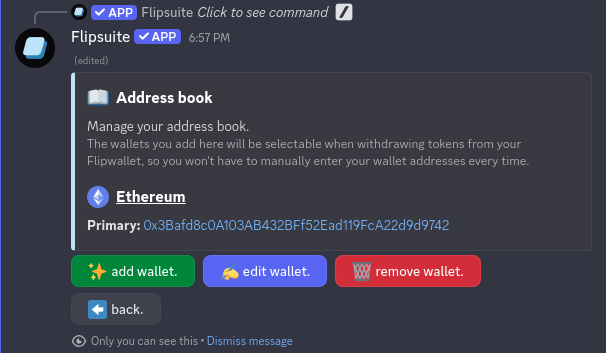 In the address book settings, you can save wallets that you often use so you don’t have to enter them every time. You will be able to quickly access them when withdrawing tokens from your Flipwallet, claiming rewards, submitting wallets to whitelists and much more.