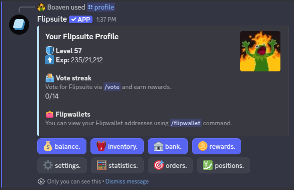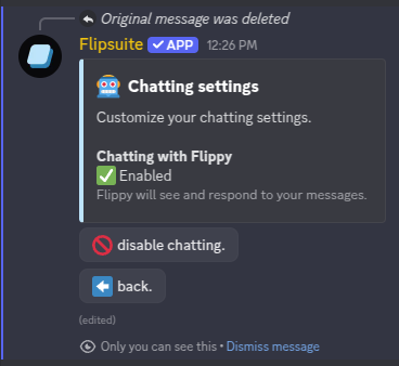 In chatting settings you can disable chatting with Flippy. By disabling this option Flippy won’t see and won’t respond to your messages in Discord.