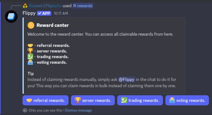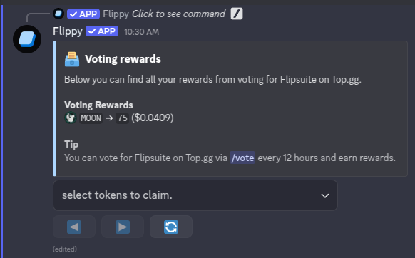 Here, you can view pending rewards that you earned by voting for Flipsuite. Every 12 hours, you can vote for Flipsuite on Top.gg to receive a random reward from the pool.