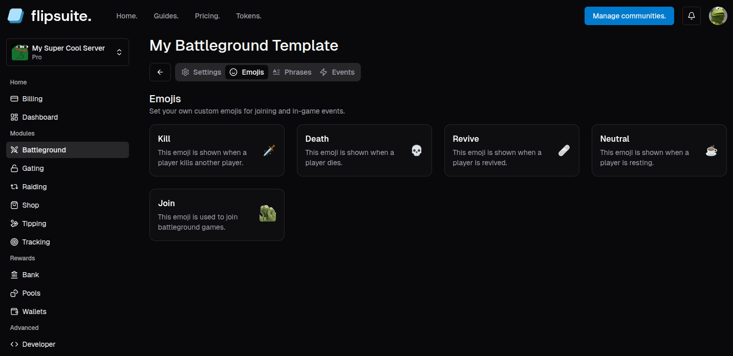 To set custom emojis for your battleground, just go to the Emojis tab and modify the emojis to your own liking.
