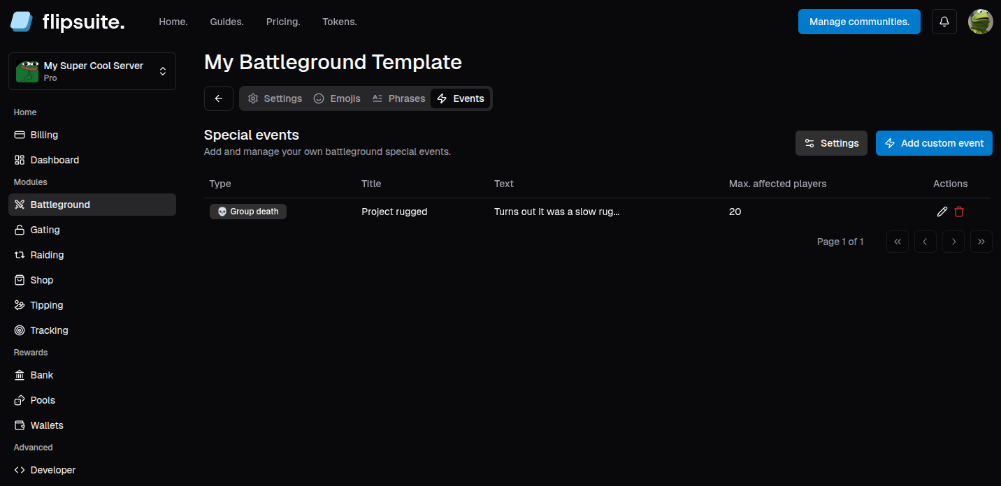To set custom events for your battleground, just go to the Events tab and click the Add custom event button to get started. You can also adjust custom events occurrence chance by clicking the Settings button.
