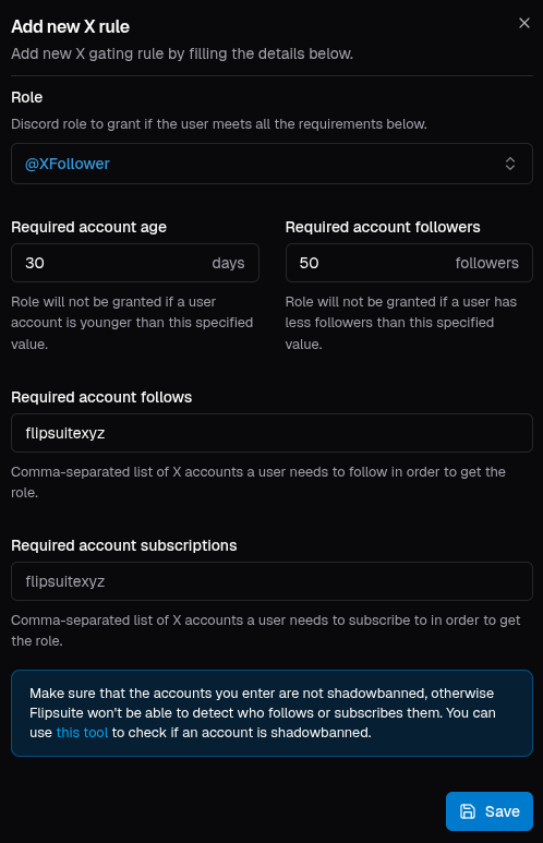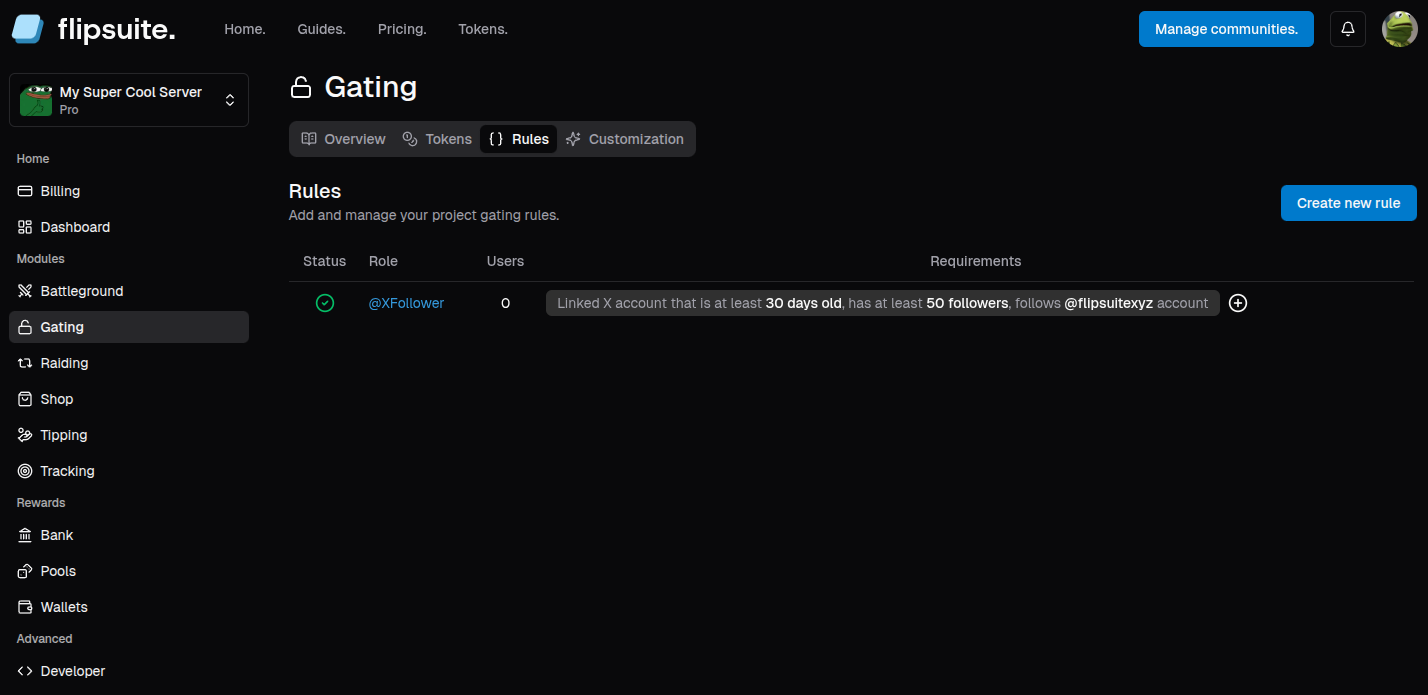 To add your first X gating rule, go to the Gating tab in your community dashboard, switch to the Rules tab, click the Create new rule button, and choose X Gating Rule to start.