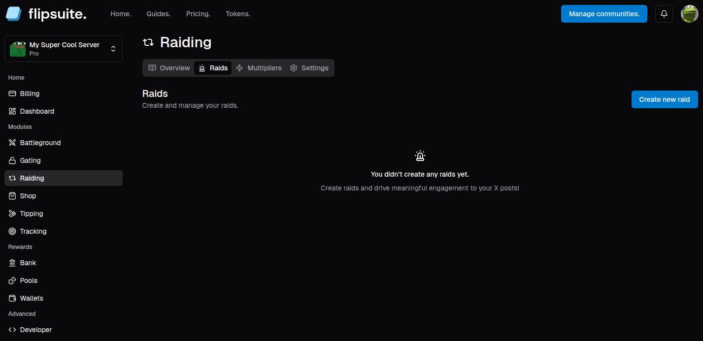 To create your first raid, go to the Raiding tab in your community dashboard, switch to the Raids tab and click the Create new raid button to get started.