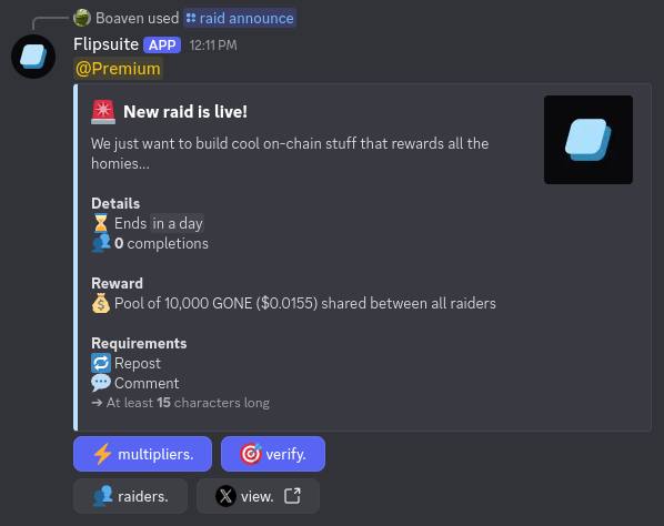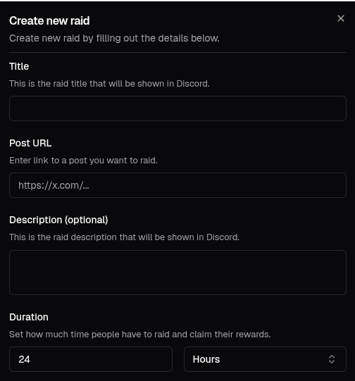 You will be asked to provide a link to the X post you want to raid, the title and description of the raid, and the time users have to raid the post.