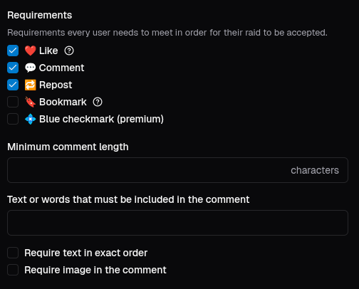 You will need to select what actions needs to be performed by each user in order for their raid to be qualified for rewards. Available actions include:- ❤️ Like: Like the post