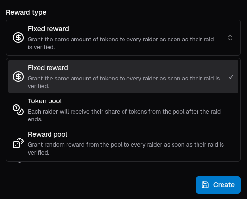 You set a total prize pool that will be distributed amongst all users who successfully raid the post once it ends. It’s a preferred choice if you want to allocate a fixed amount of tokens for each raid. - Reward pool: