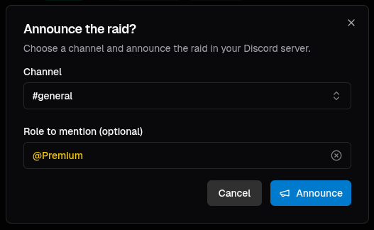 Click the Announce in Discord button on the relevant raid table row in the Raids tab. You’ll be asked to select the channel you want to announce the raid in, and a Discord role to mention.