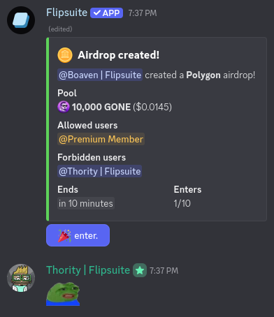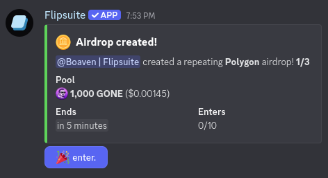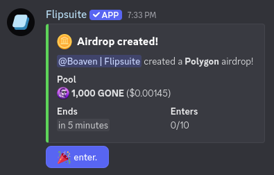 With Flipsuite, you can create airdrops directly in Discord through airdrop commands. There are multiple ways to create airdrops which we’ll explain in detail down below.Airdrops do not immediately send tokens to recipients, but require people to explicitly join the airdrop by
