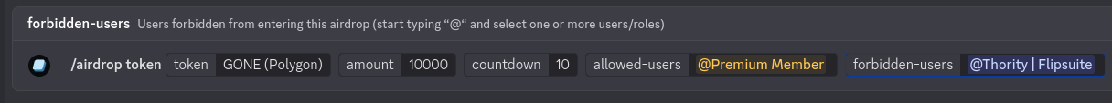 Users and/or roles forbidden from entering the airdrop. Start typing ”@” and select one or more users/roles.