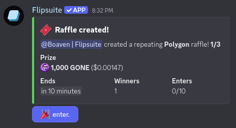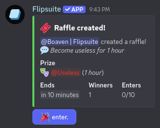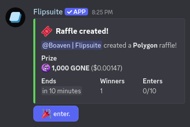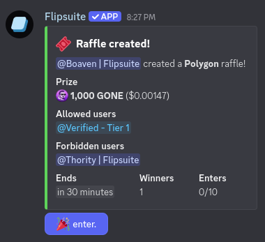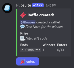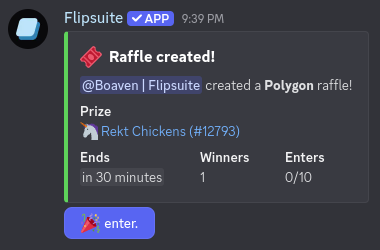 With Flipsuite, you can create raffles directly in Discord through raffle commands. There are multiple ways to create raffles which we’ll explain in detail down below.Commands