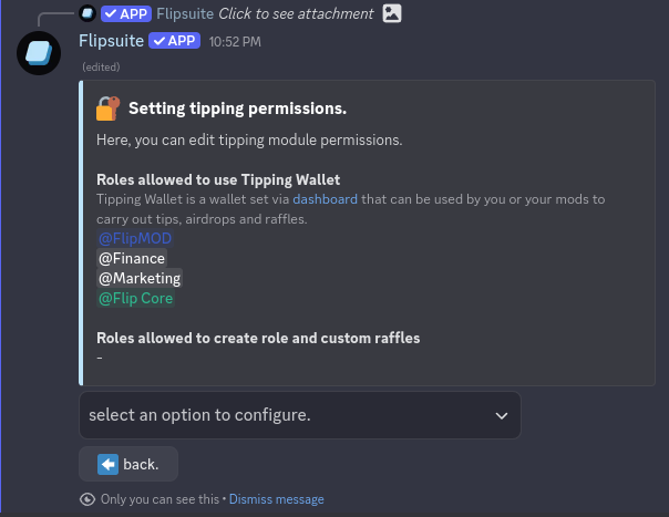 By default, only admins can create role and custom raffles in your server. If you wish to also allow your server mods to create them, you can do so via control panel in Discord. Simply go to⚙️ settings > 💸 tipping > 🔐 permissions
