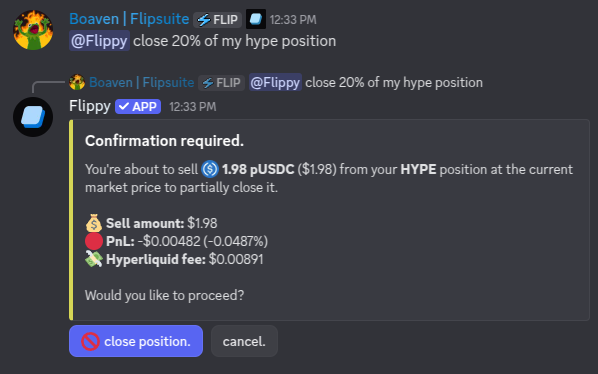 You can fully or partially close your perp positions by asking Flippy to do so:Hey @Flippy cancel X% of my HYPE position