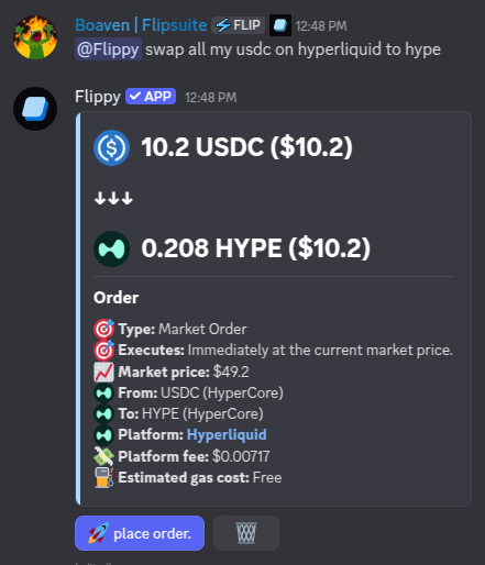 Hey @Flippy swap 50 USDC to HYPE on Hyperliquid