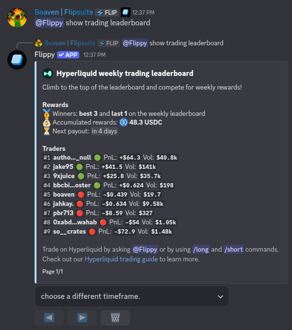 All perpetual trades you execute on Hyperliquid using your Flipwallet are tracked on the trading leaderboard. Each week, the top 3 traders and the lowest-ranking trader (person at the bottom of the leaderboard) receive a reward proportional to the generated trading fees in that week. You can access the trading leaderboard at any time by asking Flippy: