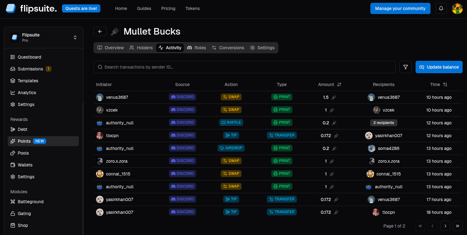 To update point system balances from the dashboard:- Open the Activity tab for the point system.