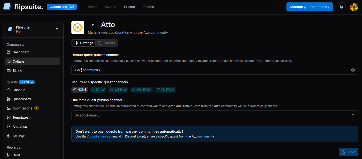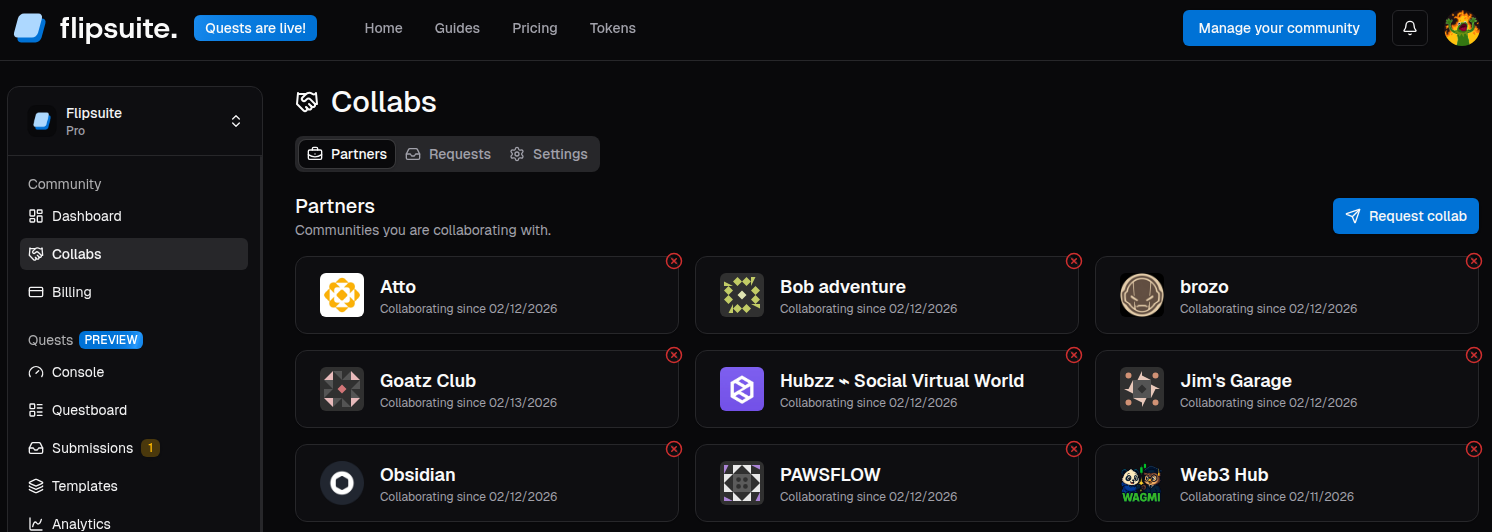 Community collabs allow different communities to form partnerships, making it easier to grow together and cross-promote content. By establishing a collaboration, you can access shared quests from partner communities and display them directly to your own community.