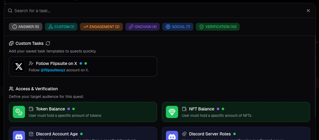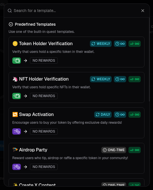 Task templates are pre-configured versions of individual tasks (e.g., a “Token Balance” task with your token details already filled in). They allow you to build new quests using common tasks without having to manually configure them.Creating a task template