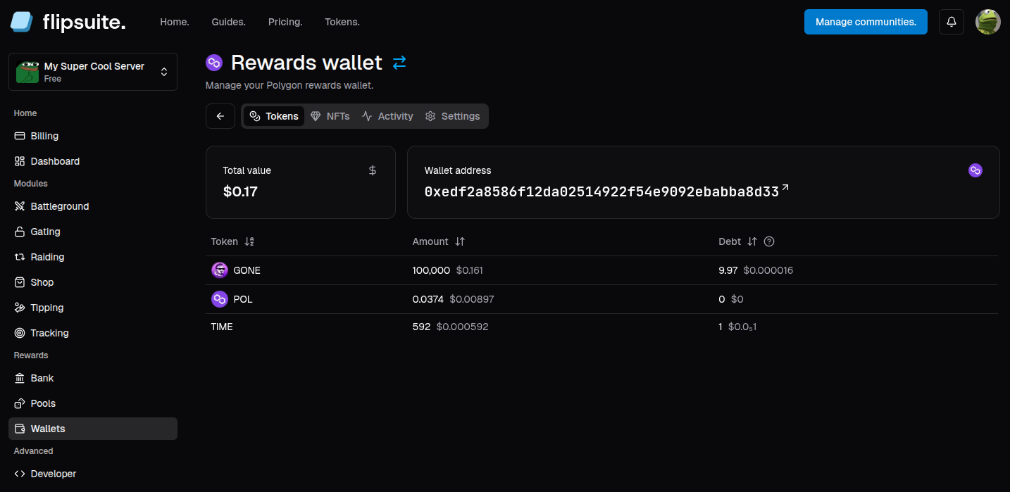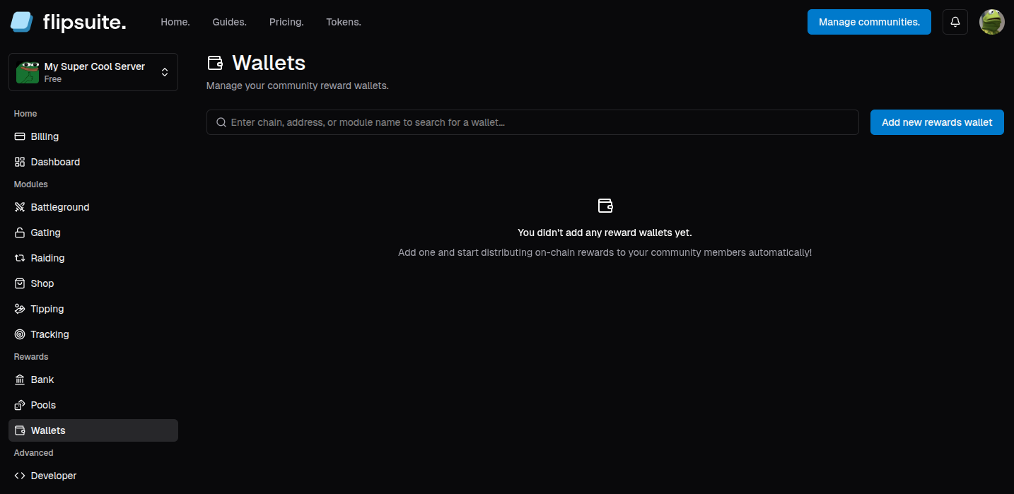 To add a rewards wallet, go to the Wallets tab in your community dashboard and click the Add new rewards wallet button to get started.