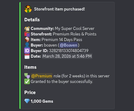 - Private channel - a channel where detailed storefront purchase logs will be posted.